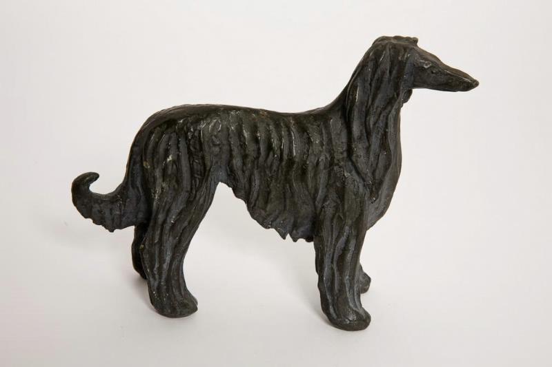 "Борзая афганская". Художественное литье. Анатомия передана достаточно точно. Поза - стоя, голова чуть-чуть повернута вправо, передние лапы на одном уровне, задняя левая чуть-чуть отставлена назад.Скульптура покрыта черным декоративным слоем. Клеймо отсутствует.