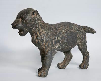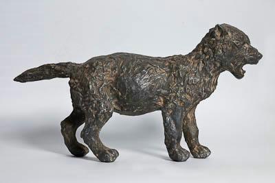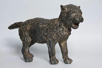 Скульптурное изображение волчонка без подножия. Животное стоит, слегка выставив вперед левую переднюю и правую заднюю лапу. Взгляд направлен вперед, уши разведены в стороны. Пасть открыта, в ней видны небольшие клыки. Хвост волчонок держит параллельно земле. Фактура шерсти передана рельефом - рыхлой, свободной лепкой.
