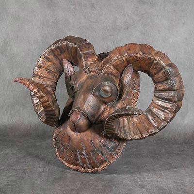 Скульптурное стилизованное изображение головы барана, выполненное в технике "выкройной" скульптуры. Объем создан при помощи сваренных между собой самостоятельных деталей, вырезанных и выгнутых из плоского листа металла. Голова барана располагается на овальном в плане медальоне-шее, который должен крепится к стене. Спирально закручивающиеся вперед рога расположены симметрично, они покрыты поперечными полосами-углублениями. Неровными насечками на морде и вокруг шеи животного обозначена шерсть.