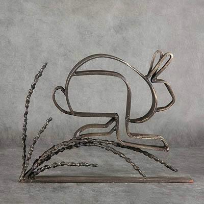 Стилизованное изображение бегущего зайца, выполненное в технике сквозного рельефа. Силуэт скульптуры создан из выгнутых и сваренных между собой плоских полос металла, шириной примерно 5 см. К подножию из плоской полосы металла приварено пять дугообразно изгибающихся под разными углами шероховатых, неровных полос, изображающих пучок травы. Заяц изображен в момент бега, когда его задние лапы вынесены вперед, а передние - назад. Животное касается травы передними и задними лапами.