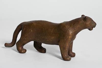 Скульптурное изображение пантеры без подножия. Животное стоит, слегка отставив назад правую заднюю лапу. Передние лапы расположены параллельно друг другу. Голова слегка повернута налево, взгляд направлен вперед, уши насторожены. Пасть слегка приоткрыта. Хвост опущен вниз, конец его изгибается вверх. Характерная окраска зверя передана при помощи фактуры: пятна на шкуре образованы точками-углублениями.