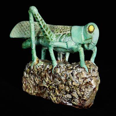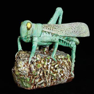 Скульптурное изображение кузнечика на подставке в виде кочки. Правое колено поставлено выше левого, т.к. левая задняя лапка опущена вниз, остальные лапки спокойно стоят на кочке. Под брюхом, есть дополнительная опора, соединяющие подставку и скульптуру. Надкрылья с прожилками, выполненными в рельефе, и нарисованными краской поперечными точками. Кузнечик светло-зеленого цвета, глаза желтые, на лапках темные поперечные полоски. Кочка покрыта рельефными изображениями злаков и трав. Углубленные части рельефа покрашены коричневым, а выступающие части подкрашены серебристой и золотистой красками, мазками желтого и зеленого цветов.
