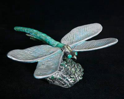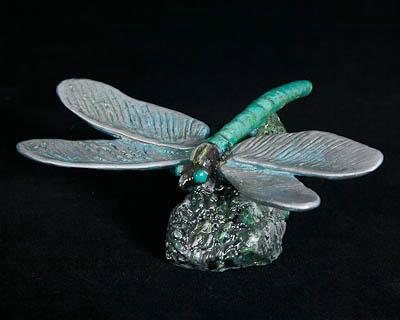 Скульптурное изображение стрекозы на подставке в виде кочки. Насекомое сидит, расправив крылья. Тело стрекозы изумрудно-зеленое, головогрудь черная с серым, глаза - изумрудно-зеленые. Углубленные прожилки на крыльях голубые, а поверхность крыльев серебристая. От кочки-подставки сзади отходят выступающие листики, поддерживающие тело стрекозы. Углубленные части рельефа покрашены черным, а выступающие части -зеленой и серебристой красками.