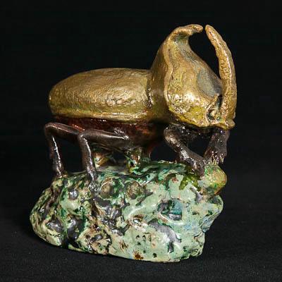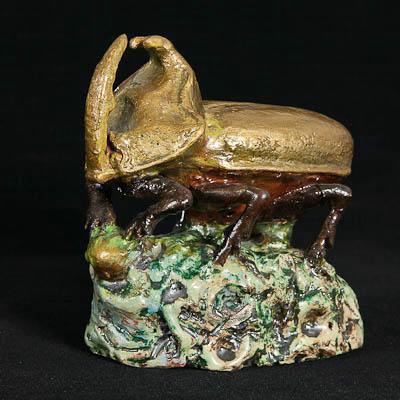 Скульптурное изображение жука-носорога на подставке в виде кочки. Передними зазубренными лапками жук придерживает маленький навозный шар, остальные лапки спокойно стоят на кочке. Под брюхом, в местах присоединения ног, есть две дополнительные опоры, соединяющие подставку и скульптуру. Надкрылья гладкие, на голове вертикально возвышается длинный рог, по бокам от него расположены глаза. Жук-носорог сверху покрашен золотистой краской, брюхо красно-коричневое, лапки черные. Кочка рельефная, разных оттенков зеленого цвета с черными пятнами.