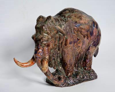Скульптурное изображение стоящего в статичной позе мамонта на подножии. Животное стоит, опустив вниз хобот, который, чуть изгибаясь влево, своим концом касается подставки. Длинная шерсть на груди и животе свисает вниз, образуя единый монолит с подставкой (просвета между брюхом мамонта и подножием нет). Глаза животного открыты, бивни небольшие, дугообразно изогнутые вверх. Скульптура покрыта коричнево-лиловой переливающейся восстановительной глазурью.