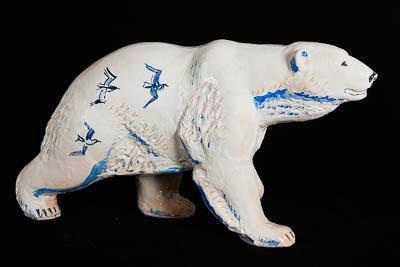 Скульптурное изображение идущего белого медведя. Правая передняя и левая задняя лапы выставлены вперед, левая передняя лапа согнута в запястном суставе, правая задняя отставлена назад. Взгляд медведя направлен вперед,. Скульптура покрыта неровным слоем глазури белого цвета, местами просвечивает светло-бежевый цвет керамической основы. Фактура шерсти передана в рельефе, а также процарапана в тесте поверх глазури. Глаза, нос, пасть, когти и подушечки лап - черного цвета. Тени на скульптуре подчеркнуты тонировкой голубого цвета. На левом боку медведя синим и голубым цветом нарисованы две летящие птицы, на правом боку - три летящие птицы. Все птицы летят вперед - к голове медведя.