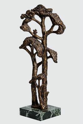 Изображены три стилизованные сосны на подставке из зеленоватого камня. Деревья обнимают друг друга ветвями, как одна семья. Два дерева высокие, а третье - маленькое, оно растет рядом с высоким, их стволы соприкасаются. На ветке самого высокого дерева сидит белка. Хвойные кроны деревьев изображены обобщенно, единой массой.