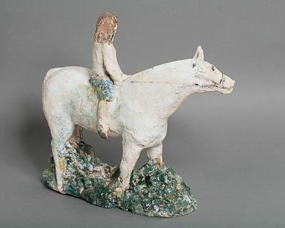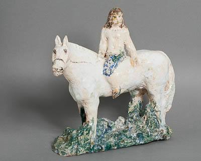 Изображена девушка, сидящая верхом на белой лошади без седла, уздечка нарисована на морде животного. У девушки темные волосы, спадающие на плечи. Она одета в белую кофту и короткие синие брюки. Девушка сидит, повернувшись всем корпусом налево, в сторону зрителя, правой рукой она удерживает поводья, а левой слегка опирается на круп коня. Лошадь стоит, повернув голову с настороженными ушами налево, взгляд направлен на зрителя. Подставка изображает высокую синевато-зеленую траву, в которой утопают ноги коня.