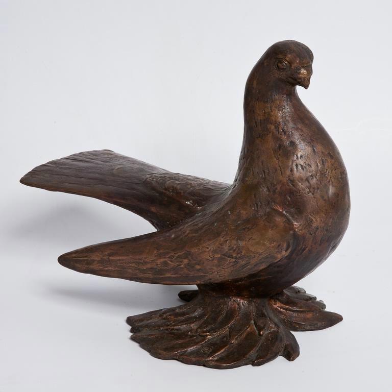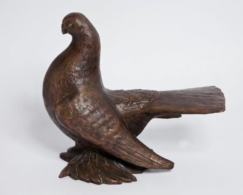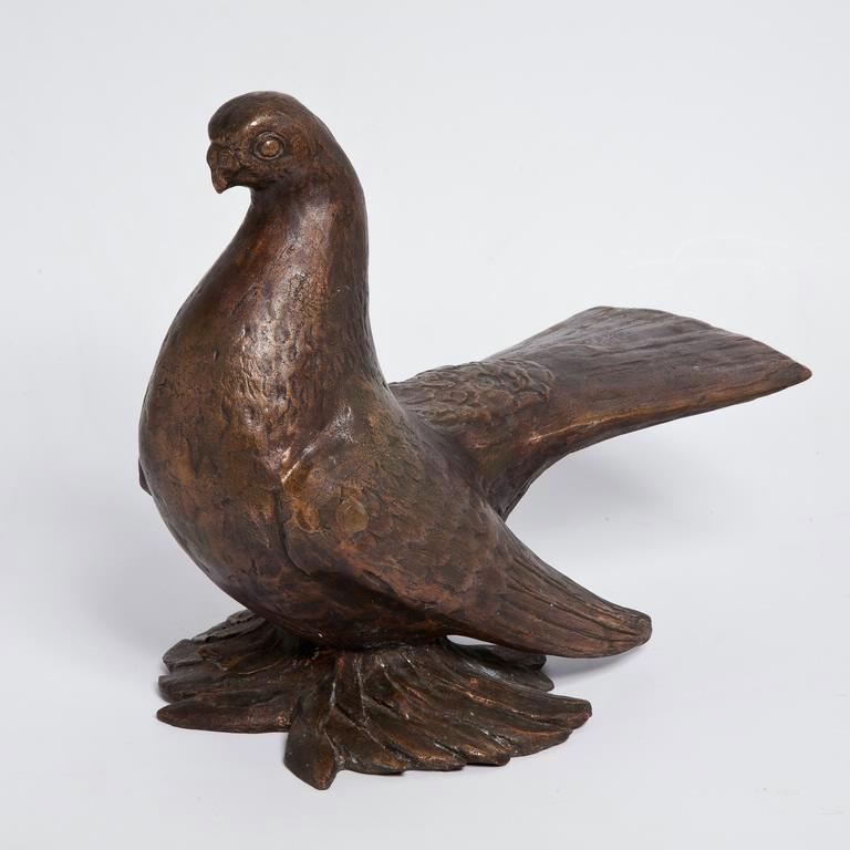 Скульптурное изображение стоящего породистого голубя. Лапки покрыты длинными перьями. Фактура перьев нанесена штрихами-углублениями.