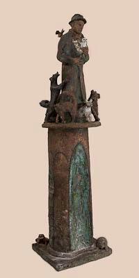 Верхняя часть разъемной скульптуры представляет собой скульптурное изображение стоящего пожилого мужчины (М.М. Петрухина) окруженного животными, на круглом постаменте. Мужчина одет в пальто и шляпу, его усатое лицо покрыто морщинами. За пазухой он держит трех белых щенят. На правом плече у него сидит птичка с поднятыми крыльями. У ног человека справа стоит на задних лапах собака, хвост которой завивается колечком. Рядом стоит кошка, выгнув спину и подняв вверх хвост. Прямо перед мужчиной сидит белая собака со стоячими ушами. Слева стоит лохматая собака, смотрящая вверх. Сзади, за спиной человека, сидит большая собака с висячими ушами, напоминающая борзую.