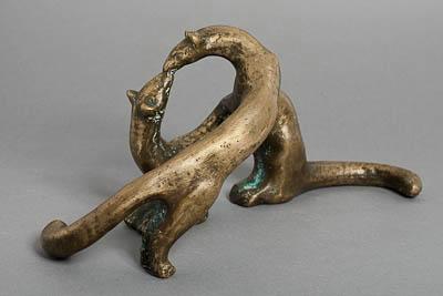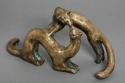 Два горностая изображены во взаимодействии, они как будто "целуются". Один из них припал к земле, спина выгнута дугой, хвост вытянут горизонтально и чуть загибается влево. Голова на длинной шее поднята вверх и обращена назад. Второй горностай стоит на задних лапах, а передними опирается на спину первому горностаю. Его шея выгнута налево, морды зверей соприкасаются носами.