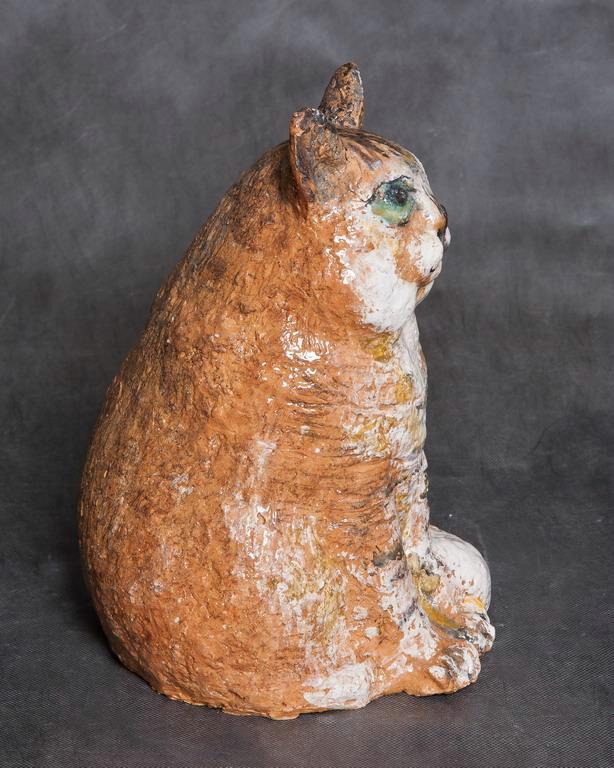 Пушистая рыжая кошка изображена сидящей прямо в статичной позе. Взгляд больших зеленых глаз направлен вперед, уши насторожены. Зрачки переданы углублениями. Морда, грудь, передние лапы и хвост белые, тело цвета охры (естественный цвет глины). На передних лапах и груди намечены темные поперечные полосы. Спина и уши темно-серые, нос черный. Фактура шерсти передана царапинами-углублениями.