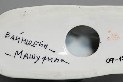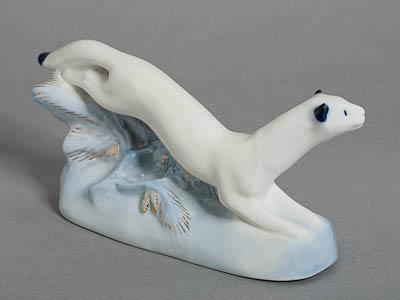 Скульптурное изображение бегущего горностая на подножии. Зверек опирается передними лапами о землю, задние лапы и хвост касаются еловых лап, стелющихся по подставке сзади. Голова горностая на длинной шее слегка повернута налево, взгляд направлен вверх. У зверя синим кобальтом покрашены кончик хвоста, уши, глаза и нос. Подставка и ветки ели тонированы светло-голубым. На хвойных лапах позолотой нарисованы длинные иголки, а также еловые шишки.