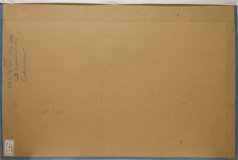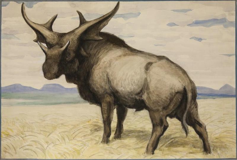 Композиция горизонтального формата. Изображен в профиль головой налево самец сиватерий. Животное стоит, слегка расставив задние ноги и повернув голову в три четверти в сторону зрителя. На голове у сиватерия две пары рогов: передние небольшие, конической формы, направленные вверх. Задняя пара рогов массивная, широкая и ветвистая. Окраска сиватерия коричневая: ноги, живот, шея и голова темно-бурые, спина и бока светлые, серовато-коричневые. Животное изображено на фоне степного пейзажа. Линия горизонта проходит чуть ниже середины композиции. Голубое небо почти сплошь покрыто белыми облаками. Ноги сиватерия утопают в желтой траве, а вдали поля становятся голубовато-зелеными. Слева виднеется некий водоем. На горизонте поднимаются голубые горы.