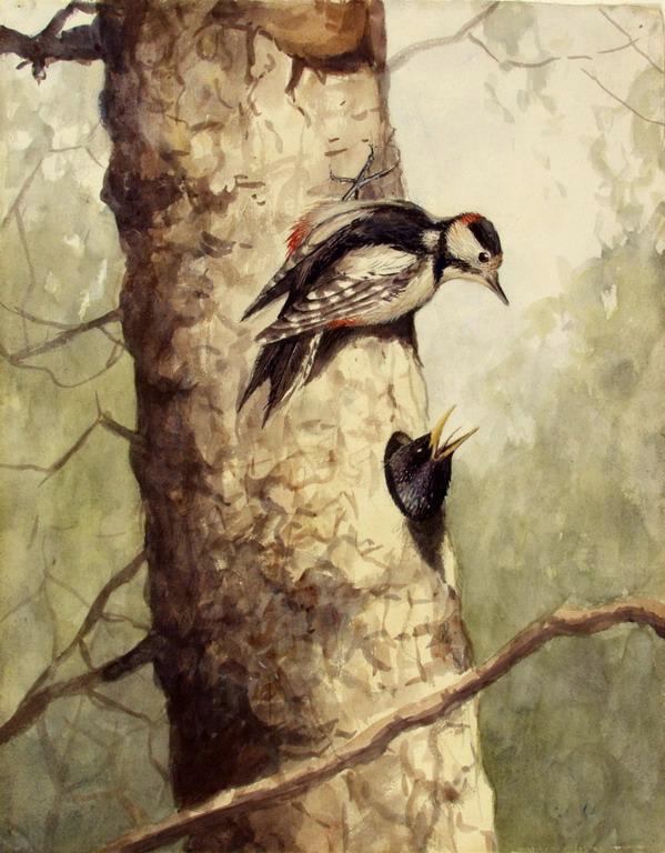 Дятел и скворцы у дупла. Рисунок