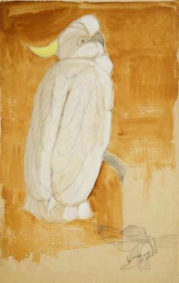 Какаду (на листе в ниж.пр. углу рис.тропич. кузнечика). Рисунок