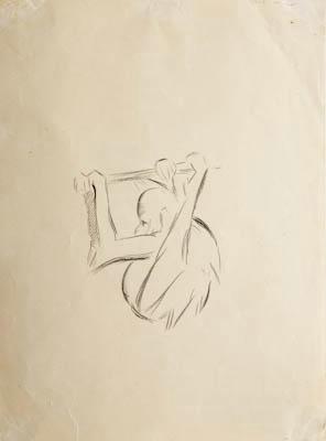 Орангутан молодой висит на ветке, вид сбоку. Рисунок