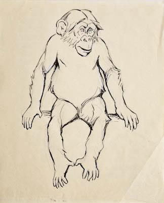Шимпанзе Иони, сидящий с опущенными вниз ногами. Рисунок
