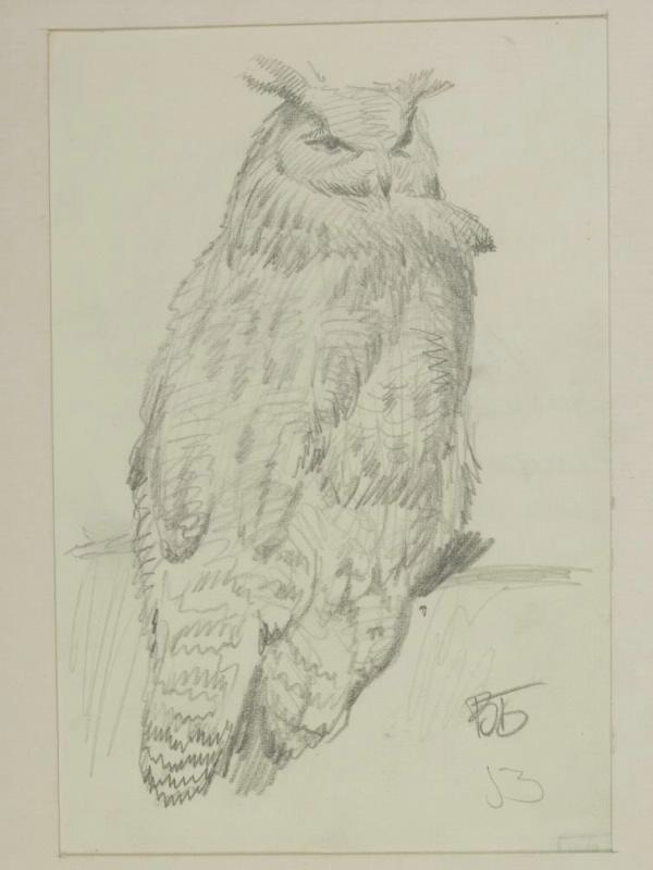 На листе крупно изображен сидящий на жерочке филин, голова птицы развернута в три четверти вправо.