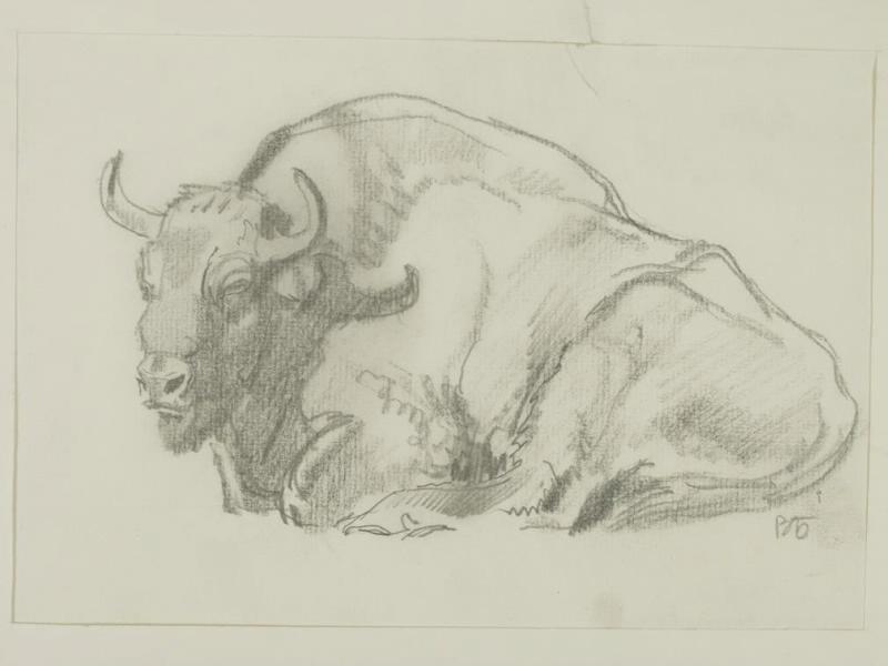 На листе крупно боком головой влево изображен лежащий зубр, его голова повёрнута в три четверти влево.