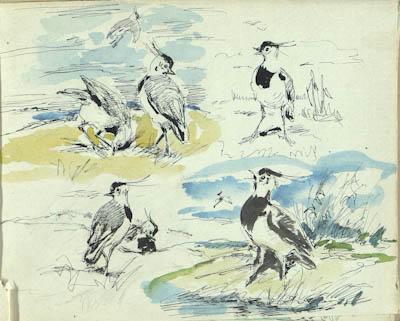 Лист зрительно разделён на четыре части, на нём выполнено четыре композиции с чибисами. Вверху слева изображены три чибиса: два стоят на первом плане, один улетает. Рисунок подкрашен акварелью. Вверху справа изображен один чибис среди травы. Внизу слева два чибиса, один – стоит, второй - сидит. Внизу справа изображен чибис, стоящий на берегу водоёма. Рисунок подцвечен акварелью. Альбом в тряпичном тиснёном бежевом переплёте, прошитом белой верёвкой, продетой в три отверстия у корешка. В альбоме 57 листов (пустых листов - три: 1,42,57).