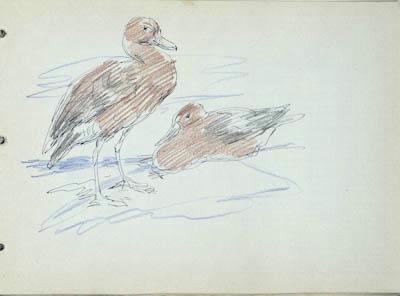 На листе крупно изображены две утки, слева – стоящая в профиль вправо, справа – сидящая, поджав под себя ноги, в профиль влево. Рисунок подцвечен коричневым и фиолетовым тоном.