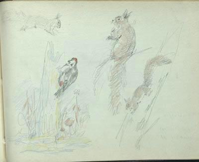 Вверху слева набросок идущей белки в профиль головой вправо. Ниже композиция с обломанным деревом, на котором сидит дятел в профиль влево и долбит кору. Под деревом изображены два гриба и травы. В центре листа вверху крупно изображена белка, сидящая на ветке, со спины, её голова в профиль влево. Слева изображен наклонённый ствол дерева, по которому слева направо вниз бежит белка. Альбом в твердом темно-коричневом переплете с рельефными пятиконечными звездами у корешка и теснённой надписью с золотистыми буквами "Альбом". Страницы альбома скреплены розовой лентой. На обложке с внутренней стороны внизу у корешка подпись: "М. Кукунов 1992". На задней обложке штамп "Артель Ленинградский печатник".