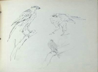 На листе три наброска ястреба-тетеревятника. Вверху слева изображен тушью сидящий на ветке ястреб. Вверху справа тушью изображен стоящий ястреб боком. Внизу справа карандашом выполнен набросок сидящего на ветке ястреба. Альбом в светлом картонном переплёте с четным корешком из кожзаменителя, страницы сшиты верёвками, продетыми в отверстия. В каждом листе по три отверстия. На внутренней стороне обложки внизу у корешка тушью подпись и дата: «М. Кукунов 1992».