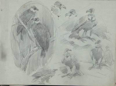 На листе 9 изображений птиц. Слева крупно в овале изображены два грифа на ветках. Вверху правее овала две головы грифа. Справа стоящий гриф в три четверти вправо, его голова повёрнута влево. Внизу правее овала изображения грифа в профиль влево. Внизу слева три стоящих грифа. Альбом в твердом темно-коричневом переплете с рельефным орнаментом у корешка (пятиконечные звезды, серп и молот) и теснённой надписью с золотистыми буквами "Альбом". Страницы альбома скреплены пестрой сине-белой лентой. На задней обложке штамп "Артель Ленинградский печатник".