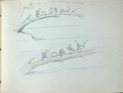 Лист разделён горизонтально на две равные половины с почти идентичными композициями. В верхней части изображена склонившаяся над водой ветка, на которой сидят шесть чаек, рисунок выполнен тушью. В нижней части такая же композиция с пятью чайками, набросок подкрашен цветными карандашами. Альбом в светлом картонном переплёте с четным корешком из кожзаменителя, страницы сшиты верёвками, продетыми в отверстия. В каждом листе по три отверстия. На внутренней стороне обложки внизу у корешка тушью подпись и дата: «М. Кукунов 1992».