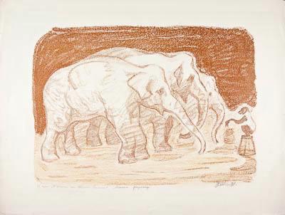 Композиция горизонтального формата, автолитография сделана в два цвета: охристо-желтый и светло-коричневый. Справа на первом плане изображена в профиль налево сидящая на тумбе мартышка Маська, одетая в белую безрукавку. Ее изогнутая левая рука вытянута вперед, как у дирижера, взмахивающего палочкой. Перед ней стоят вряд три индийских слона, изображенные в профиль направо. Хоботы их опущены вниз и вытянуты в сторону мартышки. Изображение местами тонировано красным карандашом.