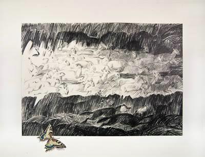 В верхней части листа на светлом фоне изображено стадо сайгаков (фигуры животных обозначены силуэтно, только линиями). В нижней части листа на темном фоне - две фигуры волков (обозначены темными силуэтами, почти сливающимися с фоном). Фигуры волков и сайгаков представлены в динамичных позах: первые преследуют, вторые - убегают.