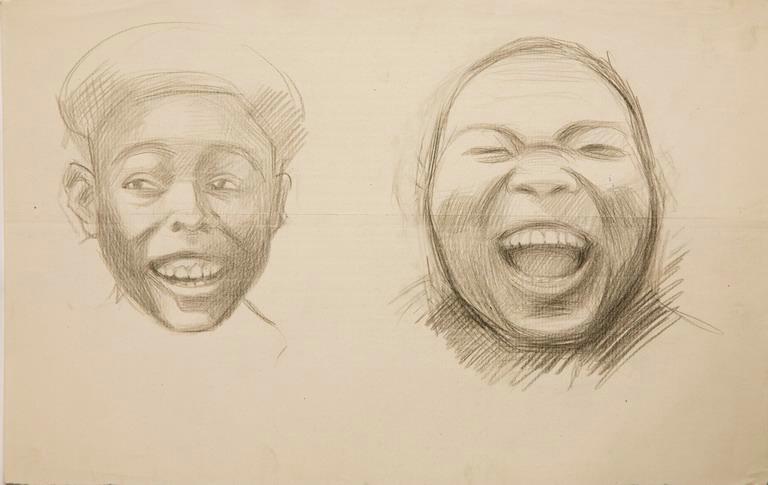 Композиция горизонтального формата. Изображены в фас две головы смеющихся людей негроидной расы. Слева расположена голова мальчика в круглой белой шапочке. Его рот раскрыт в широкой улыбке, видны белые зубы. Взгляд направлен налево. Справа находится голова взрослого человека, лицо широкое и круглое. Рот широко раскрыт в хохоте, глаза зажмурены. Рисунок выполнен крупными штрихами. В центре листа бумаги расположены водяные знаки: «REICHSADLER PAPIER.».