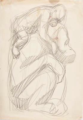 Эскиз к скульптуре "Орангутаны" из собрания ГДМ (ОФ 8734, дерево, 1975 ). Штриховой набросок профиля самки и её детёныша выполнен для передачи объёма. Детёныш сидит на верхней части туловища матери, вцепившись передними конечностями в места, где щёки переходят в шею. Позы самки и детёныша статичные.