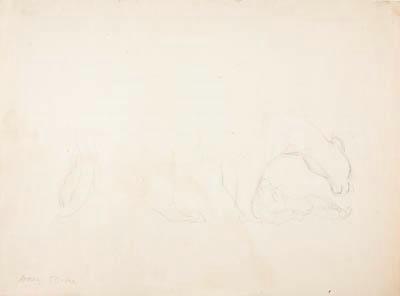 Набросок львицы силуэтный (линия спины едва намечена). Набросок львёнка схематичный (можно лишь догадываться, что это детёныш львицы). Львица-мать изображена в статичной позе. Опустив голову, она готовится приласкать своего детёныша. Возможно набросок выполнен для изготовления модели с цель дальнейшего тиражирования в фарфоровых статуэтках на ЛФЗ. Или набросок сделан для будущей скульптурной композиции в дереве.