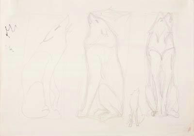 Четыре изображения сидящего волка в разных ракурсах. Позы статичные. Во всех изображениях звери воют с высоко поднятой головой. Крайнее слева профильное изображение волка (голова смотрит вправо) вписано в прямоугольную рамку (высота - 155 мм). Профильное изображение в центре (голова смотрит влево) вписано в параллелепипед (высота - 160 мм). Эти два изображения наиболее соответствует серийной статуэтке Воробьёва "Воющий волк" (ЛФЗ, 1936-1945). Крайнее справа изображение в фас (голова в полупрофиль) вписано в прямоугольную рамку (высота - 155 мм). Между центральным и правым изображениями волков представлено изображение волка в фас (высота - 60 мм), голова - в полупрофиль. В 1946 г. Воробьёв защищал диплом Всероссийской Академии художеств, его дипломной работой был диптих в дереве под названием "Волк в капкане" (олицетворение участи гитлеровской Германии). Эта скульптура, выполненная в сатирическом жанре, по сути своей была анималистической. Возможно, что эти наброски воющих волков, выполненные в 1976 г., автор выполнил для каких-то новых композиций.