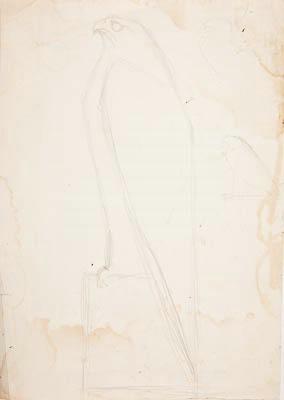 Набросок посередине листа (крупным планом) профиля сидящей хищной птицы (на подставке). Вид сзади (голова смотрит влево). Силуэтное изображение птицы. Ближе к правому краю листа представлен миниатюрный набросок профиля сидящей птицы на подставке (голова смотрит влево). Этот набросок созвучен основному, но силуэтные очертания едва обозначены, подставка намечена чертой. Возможно, эскиз к скульптуре "Беркут" из собрания ГДМ (ОФ 8901 - дерево, 1974) или к гипсовым скульптурам из собрания ГДМ "Беркут большой" и "Беркут малый" (НВФ 654, 1971 и НВФ 655, 1966)