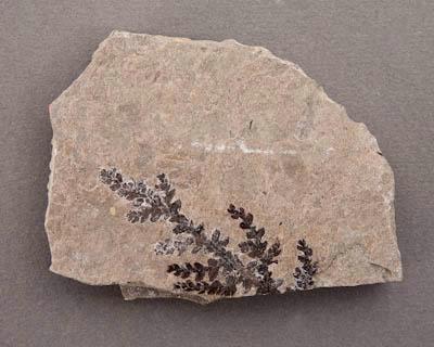 Побег хвойного Pagiophyllum papillatum Orlovskaya (местами, возможно, сохранилась кутикула и анатомическое строение) на сром мелкозернистм известняке