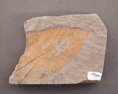rФрагмент отпечатка (желто-коричневого цвета) листа вяза Ulmus carpinoides Unge на светлокоричневом алевролите