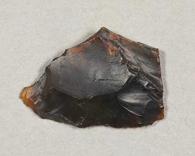 Отщеп. Кремень (?) густо чайного цвета, полупрозрачный на просвет, с многочисленными чёрными дендритоподобными включениями.