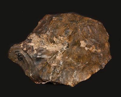 Орудие. Кремень рыжевато-коричневого цвета с чёрными внутренними и рыжими шероховатыми поверхностными включениями.
